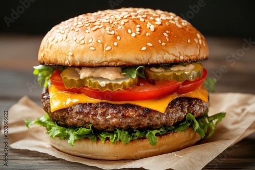 A mouthwatering beef burger topped with melted cheese, fresh lettuce, and a toasted bun, capturing the essence of comfort food.