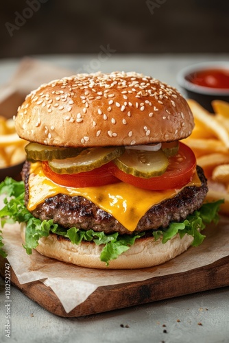A mouthwatering beef burger topped with melted cheese, fresh lettuce, and a toasted bun, capturing the essence of comfort food. Perfect for food, restaurant, and lifestyle themes.