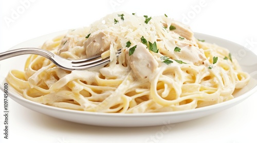 mouth-watering, plate, chicken, alfredo, pasta, creamy, garlic, sauce, grated, parmesan, cheese, each, velveting, texture, rich, favor, captured, precision, set, isolated, white, background, showcase, italian, comfort