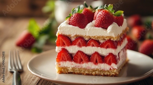 A mouthwatering strawberry shortcake with layers of fresh cream and ripe strawberries, ideal for summer dessert imagery