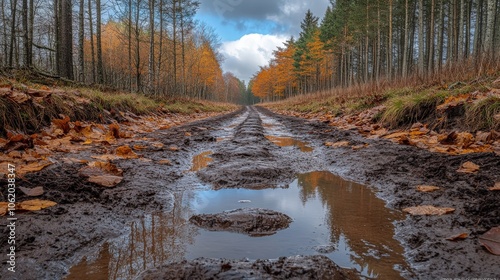 path, mud, puddle, forest, tree, autumn, leaf, nature, landscape, sky, cloud, ground, calmness, scenery, outdoors, travel, adventure, dirt, road, environment, season, beauty, warm, cool, perspective, rural, foliage, vibrant, serene, peaceful, wet, sunlight, hiking, exploration, wilderness, colours, change, depth, journey, rustic, scenic, earth, atmosphere, calm, weather, blue