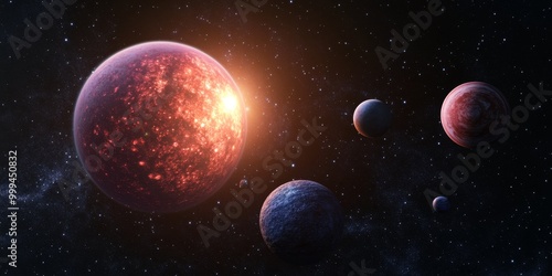a multi-planet system orbiting a distant star, showing planets of varying sizes and colors, highlighting planetary diversity.