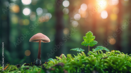 A mushroom is growing on a mossy log in a forest