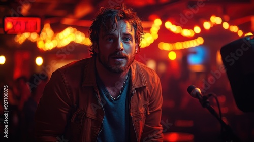 musician, man, bar, singer, stage, microphone, instrument, lighting, club, dark, performance, concert, music, nightlife, night, entertainment, red, spotlight, live, show, audience, venue, crowd, gig, band, art, artist, vocalist, guitarist, drummer, bassist, solo, song, studio, hall, vocal, singing, playing