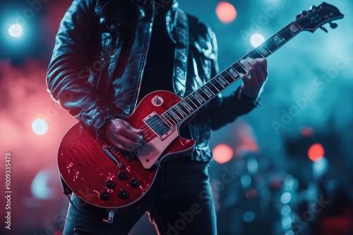 man, playing, guitar, leather, jacket, musician, rock, music, performance, artist, entertainment, event, concert, stage, live, show, popular, culture, fashion, trendy