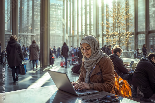 A Muslim woman in hijab working on her laptop computer in a busy station where many passengers.