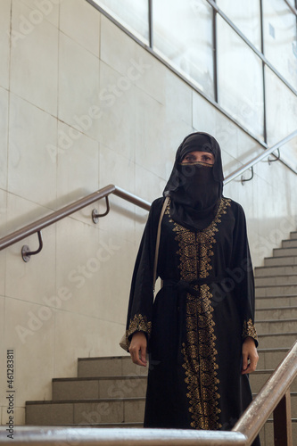 woman, muslim, outfit, national, transition, underground, descend, stair, street, city, walk, summer, arab, faith, islam, religion, black, veil, brunette, lifestyle, tradition, migrant