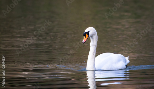 A mute swan (Cygnus olor) swims in the River Severn in Shrewsbury, Shropshire, England.