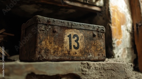 A mysterious, cursed object with the number 13 engraved, left abandoned in a dusty attic