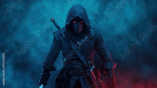 A mysterious figure cloaked in shadow, wielding a sword, shrouded in atmospheric smoke and illuminated by dramatic lighting.