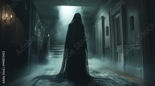 A mysterious figure shrouded in darkness stands in a foggy hallway, evoking a sense of suspense and eerie atmosphere.