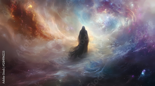 A mysterious figure shrouded in swirling cosmic light, embodying the essence of the universe's wonders and mysteries. Dreamlike Ephemeral Apparition. Illustration