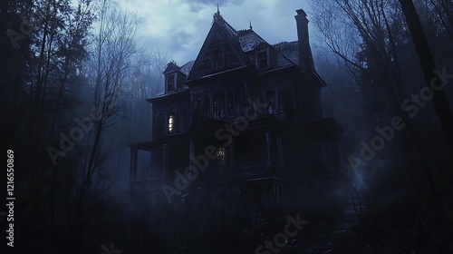 house, old, building, dark, night, tree, forest, fog, mist, skittish, creepy, abandoned, mysterious, window, light, porch, chimney, roof, branch, silhouette, shadow, haunted, scarey, gothic, vintage, atmosphere, mood, ominous, lonely, isolated, intrigue, suspense, eerie, surreal, magical, fantasy, film, horror, halloween