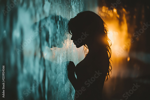 A mysterious silhouette of a woman standing behind frosted glass, creating an artistic and atmospheric effect.