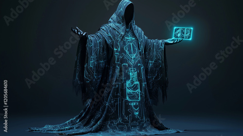 A mystic clad in flowing robes adorned with circuit-like patterns, holding a glowing data tablet as a sacred artifact. Videogame 3D model, A-pose, simple background