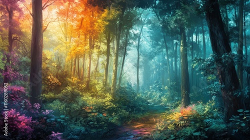 forest, path, tree, wood, nature, foliage, greenery, sunlight, mist, fog, mystical, magical, aethereal, dreamlike, vibrant, colourful, green, blue, yellow, orange, red, purple, pink, lush, dense, tall, winding, shadow, light, atmosphere, mood, scene, landscape, artwork, painting, illustration, fantasy, enchanted, beauty, calmness, serenity, peace, harmony, growth, life, journey, exploration
