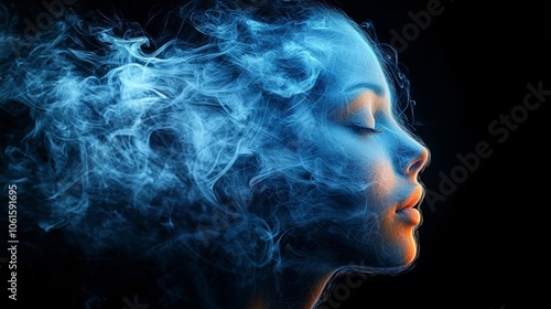 smoke, woman, face, profile, blue, orange, art, digital, creativity, expression, silhouette, beauty, emotion, mystery, abstract, light, dark, wispy, flow, fluid, aethereal, concept, dreamlike, enigma, contrast, vapour, aesthetic, female, soft, glow, movement, imagery, vision, portrait, serenity, illusion, harmony, grace, sensitivity