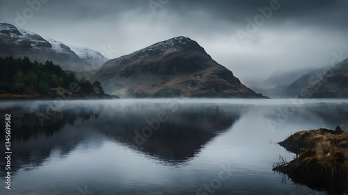 A mystical Scottish loch shrouded in mist, ultra HD, cinematic and moody