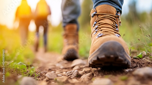 A narrow dirt trail leading through a lush forest, with a group of hikers wearing sturdy boots and carrying backpacks,
