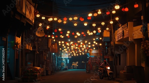 A narrow street lit with string lights, a motorcyclist rides through the alley.