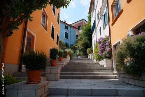 narrow, street, house, side, different, colours, potted, step, balcony, plant, architecture, tree, town, old, europa, city, building, travel, tour tourism, tradition, mediterranean, view, village, urban, summer, wall, alley, outdoors, landmark, city landscape, beautiful, mediaeval, historical, ancient, stone, facades, staircase, day, stair, picturesque, flower, door, vacation, italy, landscape, window, attraction, france