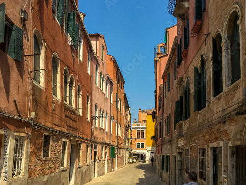A Narrow Venetian Alleyway. A narrow alleyway winds its way through the city, lined with colorful buildings that lean in towards each other.