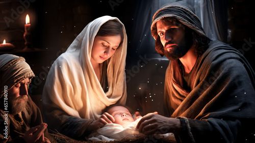 A nativity scene with Mary, Joseph and baby Jesus is depicted in the image referenced by thatotherguy in third person active voice.