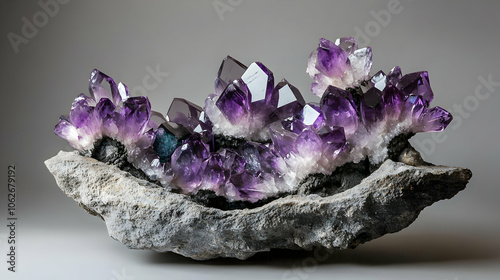 A natural cluster of amethyst crystals in deep purple tones with a white rocky base, emphasizing its raw and unpolished beauty.