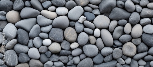 A natural material, cobblestone flooring pattern made of rocks, gravel, and pebbles stacked to resemble a stone wall on a beach