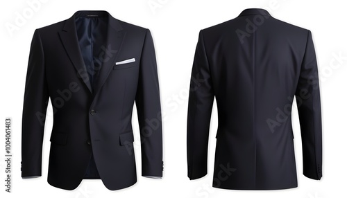 A navy blue suit jacket with a peak lapel and single-breasted closure