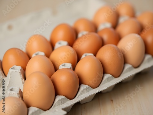 A neatly arranged egg carton filled with fresh chicken eggs perfectly positioned for culinary and food photography
