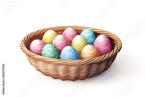 A neatly arranged wicker basket with vividly painted Easter eggs in pink, blue, yellow, and green, ultra-realistic shadows, isolated on white