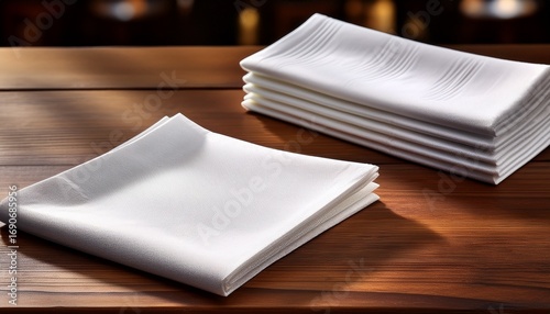 a neatly folded white napkin on a wooden table with a stack of similar napkins in the background
