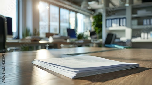 A neatly stacked pile of documents sits on a wooden desk in a bright, modern office