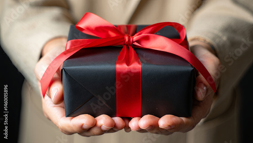 A neatly wrapped black gift box adorned with a bright red ribbon is held between two hands against a simple black backdrop, ready for giving