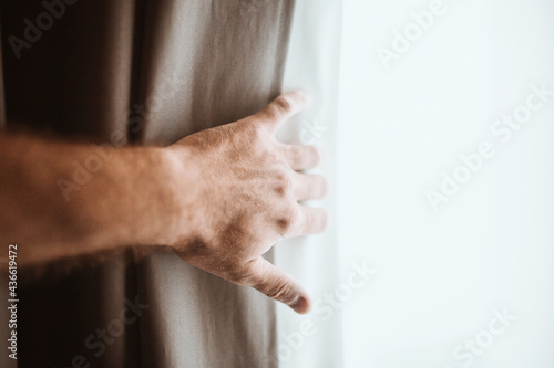 A new day through an open window - a male hand opens a thick curtain letting bright sunlight into the room