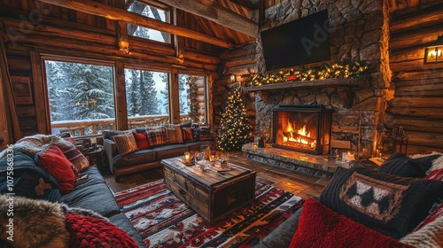 A New Year’s Eve celebration in a cozy cabin with friends toasting by the fire as the clock strikes midnight Blankets and warm lights create a cozy festive atmosphere for the new year A peaceful
