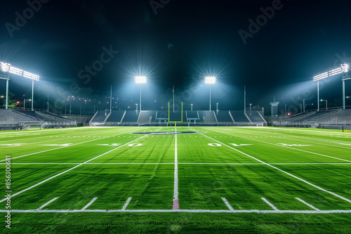A Night View of a Large Empty Football Stadium Illuminated by Bright Floodlights, Showcasing the Vibrant Green Turf and Yard Lines Under a Clear Sky