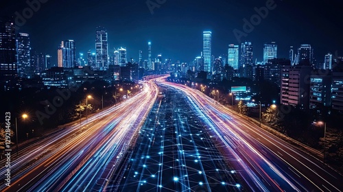 A Night-Time Highway with Long, Colorful Light Trails from Fast-Moving Vehicles, Representing Digital Innovation, Technological Growth, and the Future of Connectivity.