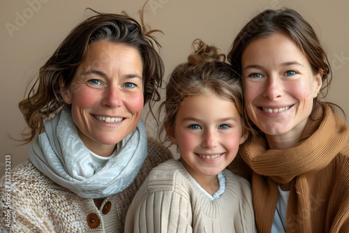 A nontraditional family photo with a child, happy family looking in the camera and smiling