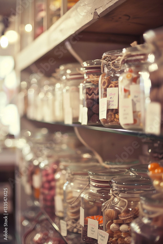 A nostalgic and charming candy store display featuring glass jars filled with assorted colorful sweets on neatly arranged shelves, evoking timeless childhood memories and an inviting atmosphere of