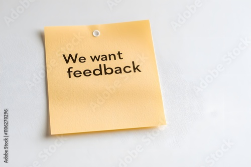 A note with ‘We want your feedback’ written on it, symbolising the importance of customer opinions and engagement for improvement and growth
