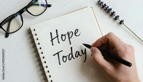A notebook with the word hope, a pen, and glasses, representing tenacity and kindness in a diverse community setting
