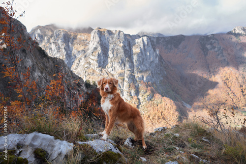 A Nova Scotia Duck Tolling Retriever stands on a rocky ridge overlooking a scenic autumn landscape. The rugged terrain and the dog's posture reflect a sense of adventure and exploration.