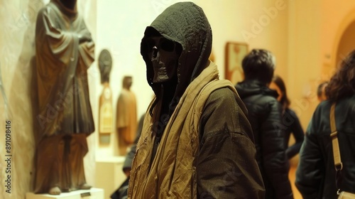 figure, museum, art, sculpture, hood, modern, exhibition, clothing, crowd, style, event, visitor, mystery, era, presence, heritage, narrative, abstraction, history, aesthetic, expression, atmosphere, emotion, visual, curator