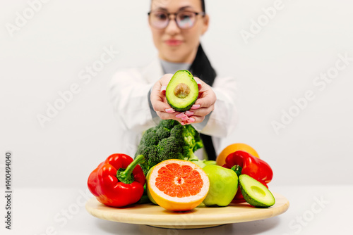 A nutritionist in a lab coat with an avocado in hand sits at a table of fresh fruits and vegetables in a bright office of a modern clinic. Healthy eating concept.