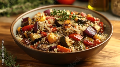A nutritious bowl of quinoa, roasted vegetables, and a drizzle of olive oil, placed on a wooden table with a sprig of fresh herbs for decoration