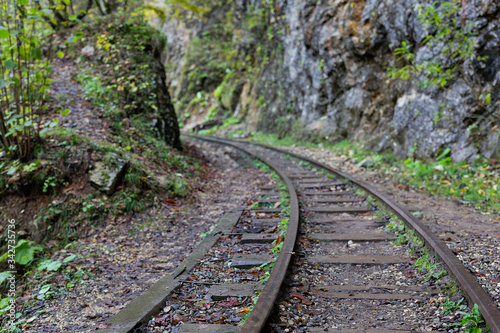 A old narrow gauge railway. A canyon Guamka, Russia, Krasnodar. A forest, a creek and rock at autumn.