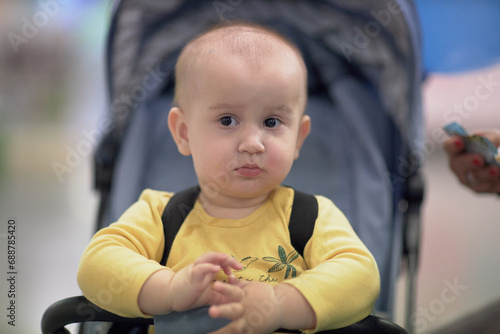 a one-year-old child, a boy, eats on the road, has a snack on the way in a stroller