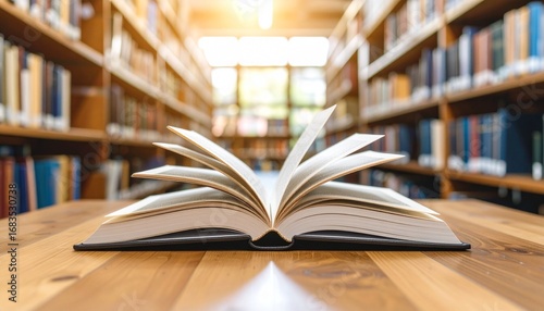 a Open book with fanned pages displayed on wooden table in cozy library